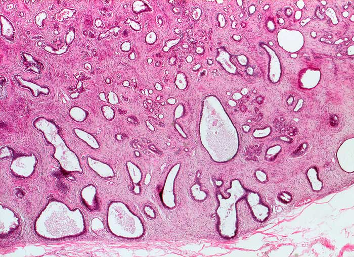 Biphasischer Tumor bestehend aus reichlich zellreichem Stroma und rundlichen unterschiedlich weiten, nicht komprimierten Drüsen (perikanalikuläres Fibroadenom).