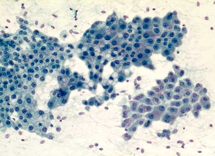 apokriner (onkozytärer) Zellen mit grossen runden Kernen und prominenten Nukleolen. Reichlich fein granuliertes, teils eosinophiles Zytoplasma. Zahlreiche bipolare nackte Kerne (