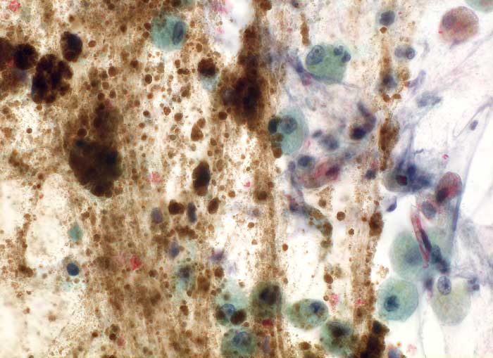 Bronchialsekret: Stark Melanin bildende Zellen. Das Melanin überdeckt die Kerne vollständig. So sind nur in wenigen Zellen Kernatypien zu sehen.