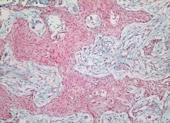 Solider Tumorzellverband ohne erkennbare Verhornung. Reichlich desmoplastisches Stroma.
