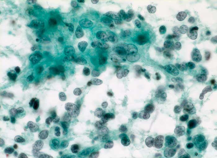 Frischgewebsabstrich: Überwiegend einzeln gelagerte Tumorzellen von sehr unterschiedlicher Grösse und Form. Die Kerne sind teils embryonenartig gebuchtet. Detritischer Hintergrund.