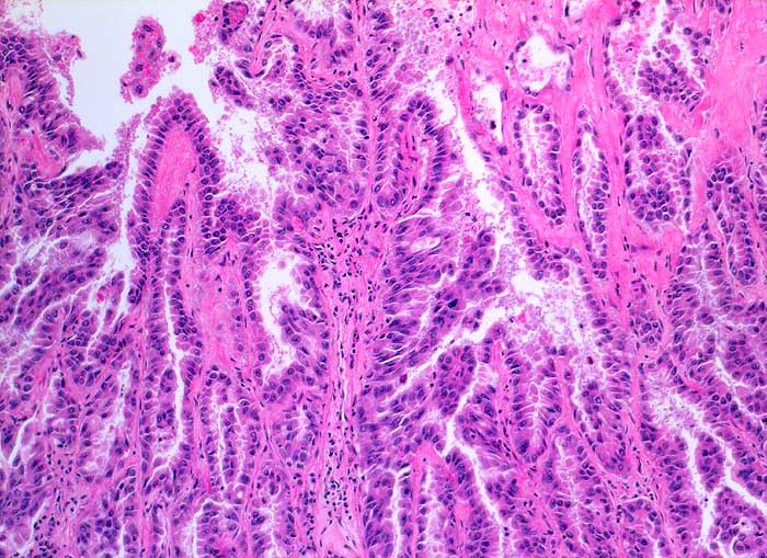 Papilläre und tubuläre Strukturen ausgekleidet von atypischem hochprismatischem Epithel entsprechend einem hochdifferenzierten Adenokarzinom.