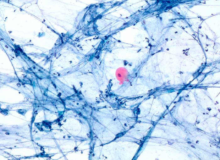 Zytologische Diagnose: Befund spricht für Pleuraempyem bei broncho-pleuraler Fistel.