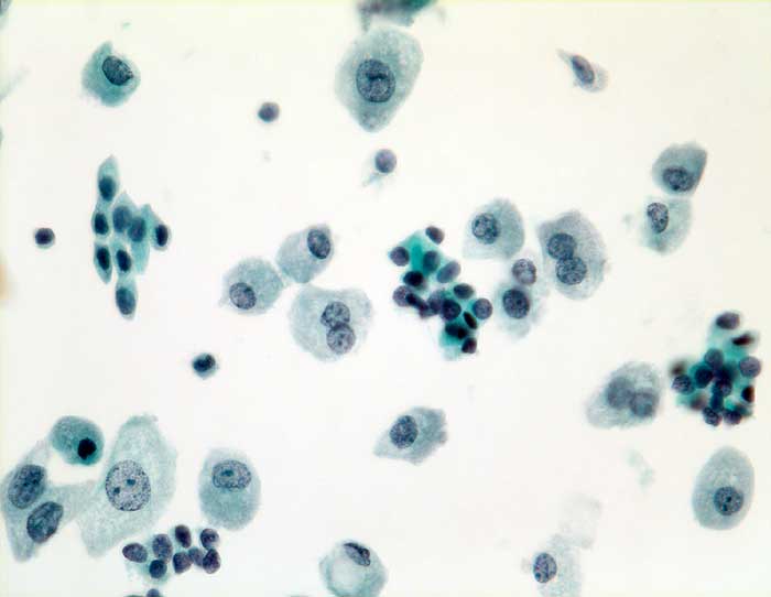 Harnblasenspülflüssigkeit: Ein oder mehrkernige Deckzellen (=Schirmzellen) mit reichlich Zytoplasma ähneln Plattenepithelien. Verbände von zylindrischen intermediären Zellen mit mässig viel Zytoplasma und kubische Basalzellen mit kleinen runden hyperchromatischen Kernen und wenig Zytoplasma.