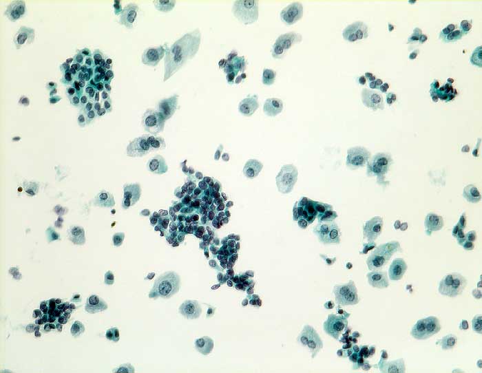 Harnblasenspülflüssigkeit: neben mehrkernigen Deckzellen mit reichlich Zytoplasma finden sich kleine Verbände von zylindrischen intermediären Zellen mit mässig viel Zytoplasma.