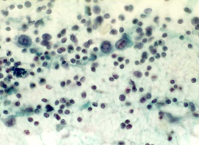 Feinnadelpunktion Lymphknoten supraclaviculär links: Gemischtes reaktives Infiltrat bestehend aus Lymphozyten, Plasmazellen, eosinophilen Granulozyten und Histiozyten. Darin einzelne grosse einkernige Hodgkinzellen mit prominenten Nukleolen