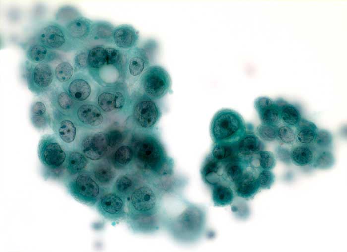 atypischen kubischen Zellen. Die Zellen sind ziemlich gleichförmig und besitzen rundliche, grob strukturierte Kerne mit meist mehreren Nukleolen.