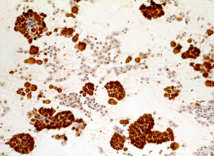 Pleurapunktat: Die rundlichen und papilliformen Tumorzellverbände sind deutlich positiv für den Panzytokeratinmarker Lu-5. Makrophagen und Lymphozyten sind negativ.