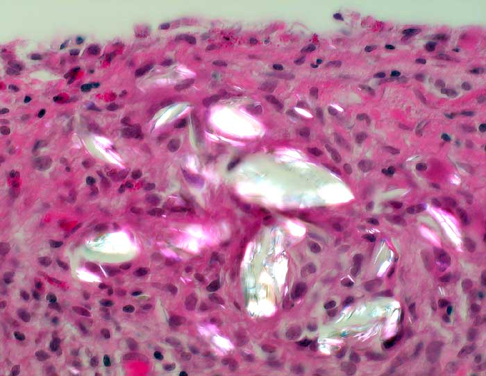 Reichlich doppelbrechendes Material im subpleuralen Bindegewebe. Eosinophilenreiche Entzündung.
