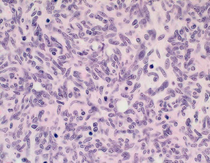 Spindelige Zellen mit blander Morphologie und eingestreuten kleinen Lymphozyten. Die Spindelzellen zeigen ein angedeutet storiformes Wachstumsmuster.