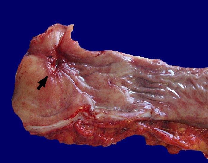 ypT3, ypN0. Vitaler Tumorrest im Ulkusgrund.