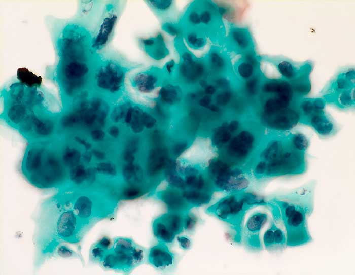 Transbronchiales Feinnadelpunktat: unregelmässiger Verband von grösseren Epithelien mit grossen und entrundeten Kernen die oftmals auch einen prominenten Nukleolus enthalten. Daneben auch einige vielkernige Zellen. Das Zytoplasma ist aber relativ breit und zum Teil auch angedeutet fein vakuolisiert.