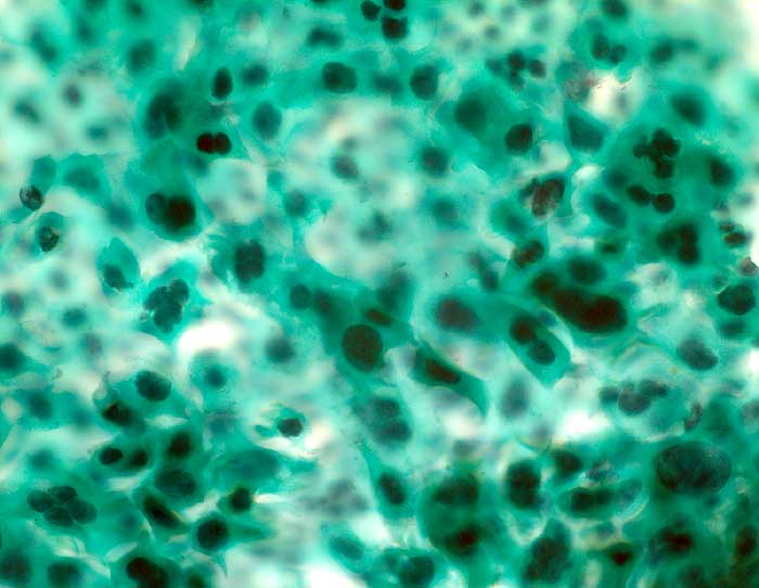 Transbronchiales Feinnadelpunktat: Grössere Epithelien mit grossen und entrundeten Kernen. Daneben auch einige vielkernige Zellen. Das Zytoplasma ist aber relativ breit und zum Teil auch angedeutet fein vakuolisiert.