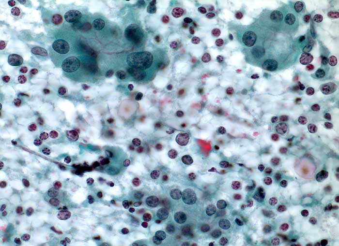 Frischgewebsabstrich Schilddrüse: Das sehr zellreiche Präparat erinnert an ein Lymphknotenpunktat. Es überwiegen Lymphozyten, vereinzelt auch Plasmazellen. Im Hintergrund onkozytäre Epithelien, die kleine Follikel bilden. Die Thyreozyten sind aktiviert und zeigen Atypien.