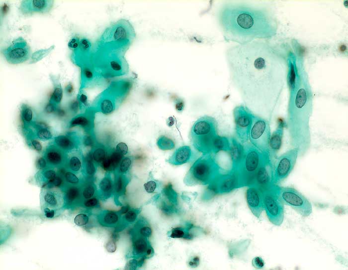Portio: rhombenförmige und leicht abgerundete unterschiedlich ausgereifte metaplastische Plattenepithelien mit milchglasähnlichen Kernen bilden einen mosaikartigen Verband.