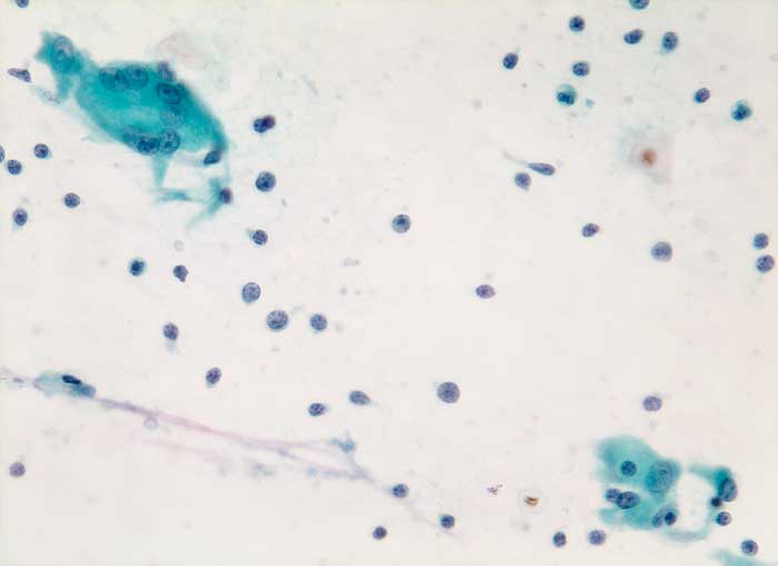 Feinnadelpunktion Schilddrüse: Einzelne Epitheloidzellen (rechts unten), Riesenzelle vom Langhanstyp und Lymphozyten. In diesem Bild keine Schilddrüsenepithelien.