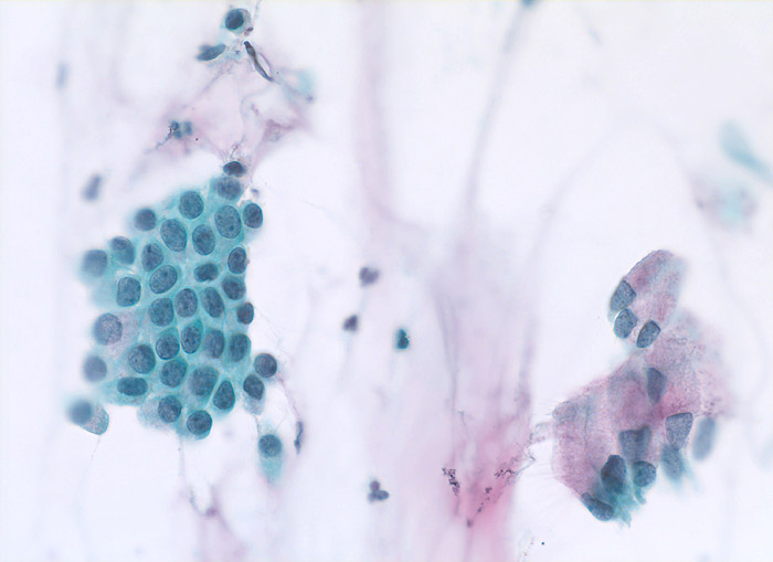 Zervixabstrich: links im Bild in der Aufsicht regelmässiger honigwabenartiger Zylinderzellverband ohne Atypien. Rechts im Bild ein Verband von Zylinderzellen in der Seitansicht mit basalständigen Kernen und schleimhaltigem rosafarbenem Zytoplasma.