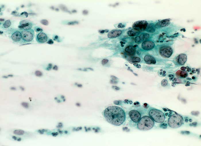 Portioabstrich: Dichte Aggregate unausgereifter Epithelien mit mässig polymorphen, deutlich vergrösserten, grob strukturierten Kernen. Schmaler zyanophiler Zytoplasmaleib. Kleine Nukleolen.