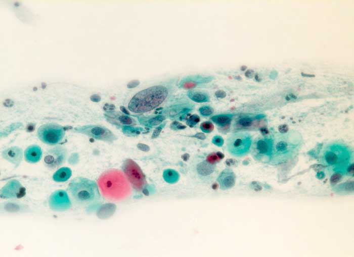 Vaginalabstrich: Neben grösseren Verbänden von unausgereiften atrophischen Plattenepithelien, ein deutlich vergrösserter Nacktkern.