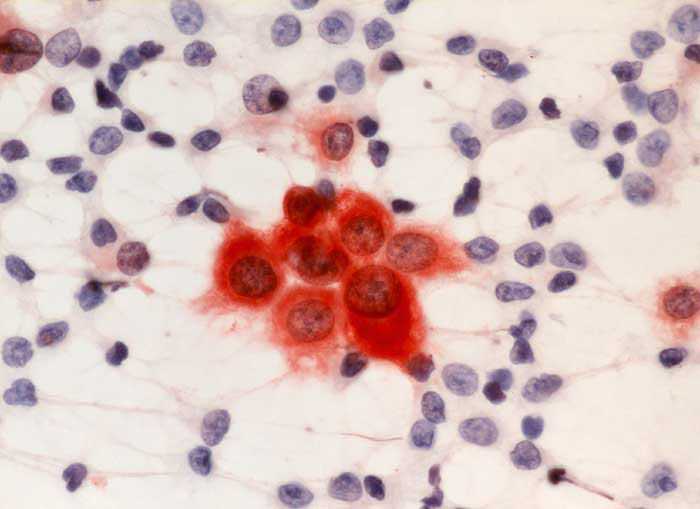 Aszites: die atypischen Zellverbände sind deutlich positiv für den Mesothelzellmarker Calretinin.