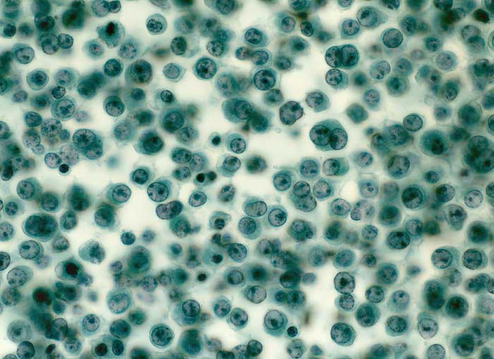 Aszites: Massenhaft dissolute Zellen eines grosszelligen Lymphoms mit polymorphen, vesikulären Kernen und fragilem Zytoplasma. Zentraler oder randständige prominente Nukleolen.