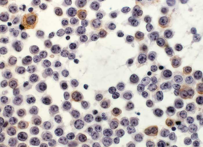 Aszites: Die atypischen lymphoiden Zellen sind teilweise zytoplasmatisch positiv für den B-Zell Marker CD20.