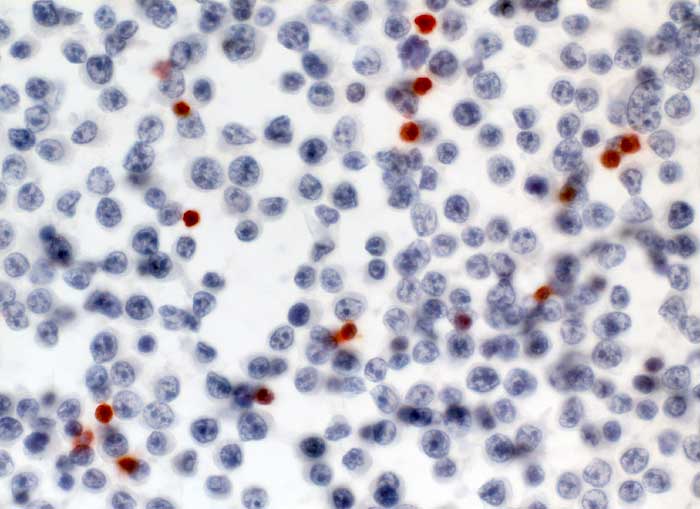 Immunzytochemisch sind die atypischen lymphoiden Zellen negativ für den T-Lymphozytenmarker CD3. Ca. 10% der Tumorzellen zeigen dagegen eine deutliche Positivität für den B-Lymphozytenmarker CD20. Somit handelt es sich um einen peritonealen Befall des in der Biopsie nachgewiesenen diffusen grosszelligen B-Zell-Lymphoms.