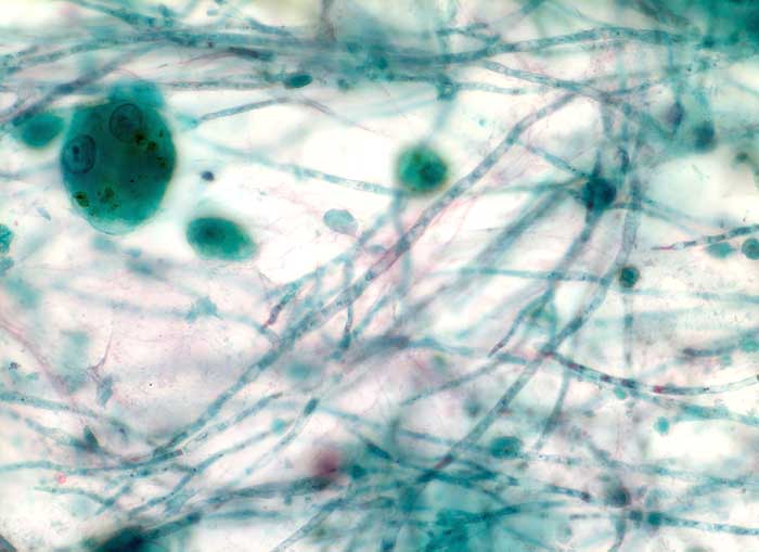 Broncho-alveoläre Lavage: Schon in der Papanicolaou Färbung sind die Pilzhyphen deutlich erkennbar. Daneben mehrere Makrophagen.