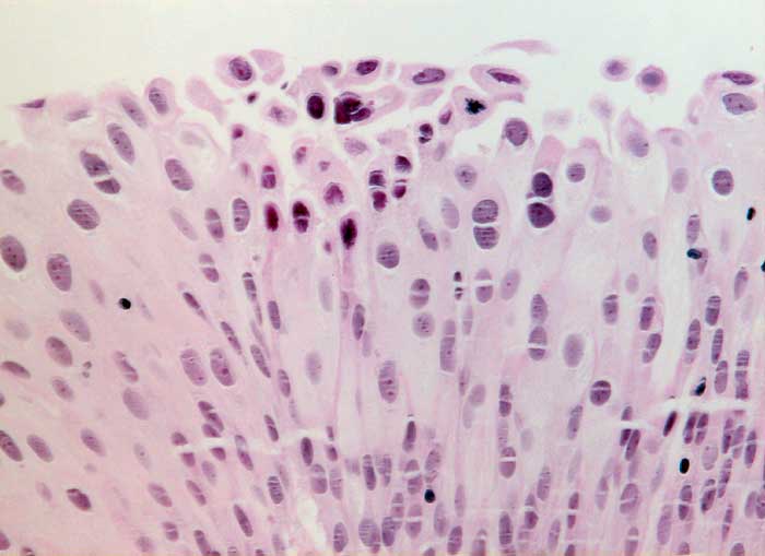 Urothel leicht verbreitert. Unvollständige Ausreifung mit relativ grossen lumennah gelegenen Zellen. Leichte Hyperchromasie und Polymorphie der Zellen. Mitose im lumennahen Epithel.