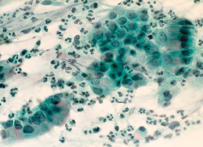 Portioabstrich: Regelmässige Verbände aus Zylinderzellen. Kerne vesikulär, vergrössert, das Chromatin fein granulär. Nukleolen vergrössert. Zytoplasma mittelbreit, uncharakteristisch. Keine schweren Atypien. Mässig viele Granulozyten.