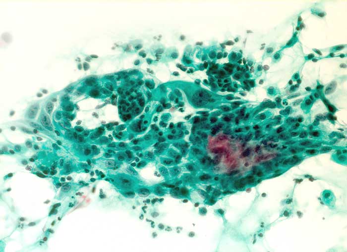 Portioabstrich: Polygonale und zylindrische Zellen mit vergrösserten vesikulären Kernen. Im Hintergrund neutrophile Granulozyten.