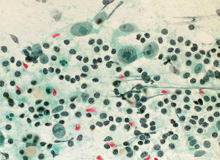 Feinnadelpunktion Lymphknoten cervikal links: Einkernige Hodgkin Zellen mit grossen Kernen und Makronukleolen. Reaktive Entzündungszellen.