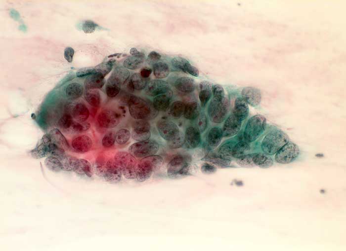 Zervixabstrich: Verband zervikaler Zylinderzellen. Kerne mässig vergrössert, leicht polymorph, Chromatin granulär. Einzelne leicht vergrösserte Nukleolen. Deutliche Erhöhung der Kern-Zytoplasma Relation. Die Zellen sind in unregelmässigen Abständen gelagert und überlappen sich teilweise.