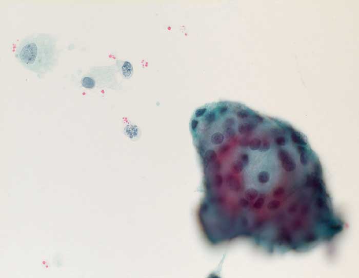 Makrophagen mit reichlich Zytoplasma und ovalen hellen Kernen ist ein runder Zellverband ohne Atypien sichtbar (Zystenwandauskleidung).