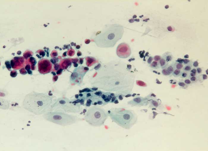 Portioabstrich: Im zervikalen Abstrich erkennt man neben ortsüblichen Elementen kleine lockere Verbände von atypischen, teilweise degenerativ veränderten Epithelien. Die Kerne sind teils