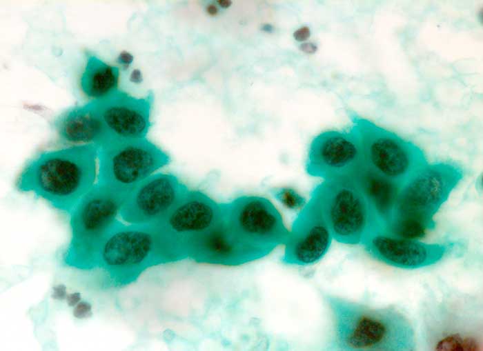 Cavum uteri, Spülflüssigkeit: Hochgradig atypische Epithelien. Die Kerne sind rund bis ovalär, oft auch polymorph. Das Chromatin ist grob