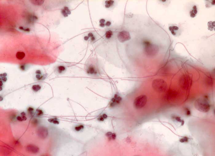 Dünne fadenförmige Bakterien, Intermediärzellen und neutrophile Granulozyten.