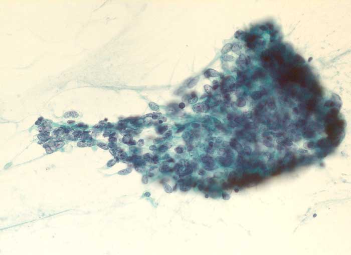 Uterus, Frischgewebsausstriche: Dichter Haufen polymorpher Tumorzellen mit unterschiedlich grossen länglichen hyperchromatischen Kernen. Die Zellgrenzen sind unscharf. Zytoplasma ist nur wenig vorhanden und scheint fragil.