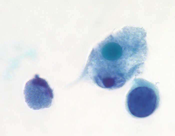 Teils nacktkernige Tubulusepithelien mit milchglasartigem Kernplasma (Viruspartikel). Das zelleigene Chromatin ist an die Kernmembran gedrückt. In der Mitte eine Epithelzelle ohne Kerneinschluss enthält im Zytoplasma einen hyalinen Einschlusskörper.