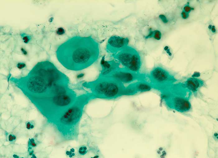 Zytologische Diagnose: Epithelien mit Kernatypien. Die vorhandenen Kernatypien lassen sich noch als Reaktion auf die vorausgegangene Strahlentherapie interpretieren (sog. "Strahlenatypie"). Ein Rezidiv des Plattenepithelkarzinoms liegt nicht vor.