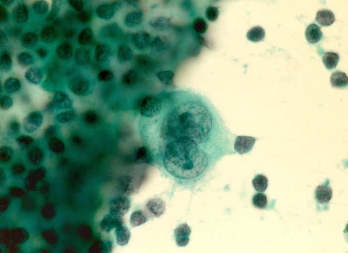 Frischgewebsausstrich Halslymphknoten links: Neben zahlreichen kleinen Lymphozyten zweikernige Reed-Sternberg Zelle mit grossen Nukleolen.