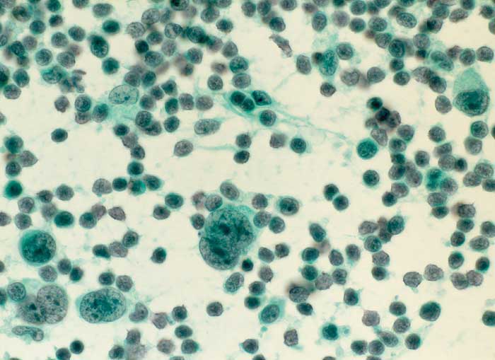 Zytologische Diagnose: Gemischtzelliges lymphozytäres Zellbild mit einigen teils doppelkernigen atypischen blastären Zellen, vereinbar mit Morbus Hodgkin (am ehesten gemischtzelliger Typ).