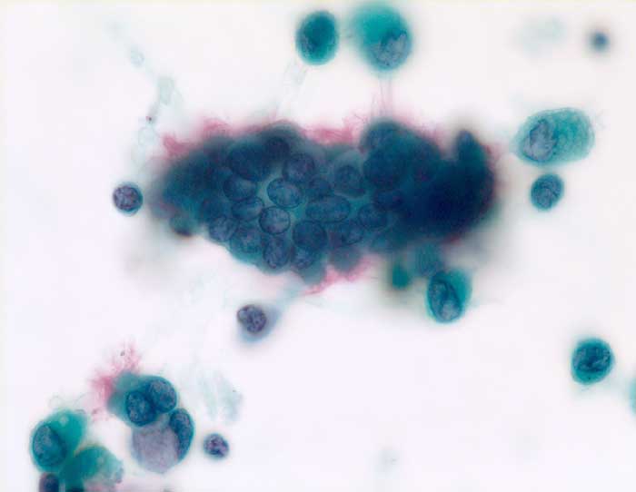 Kugeliger Verband hypertropher Flimmerzellen. Die Zellkerne sind gross, aber nicht atypisch. Das Vorhandensein von Flimmerhaaren beweist ihre Gutartigkeit.