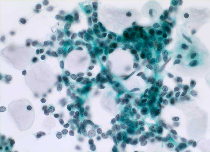 Transbronchiale Lungenbiopsie: Kribriformer Verband atypischer Zellen. Diese sind nur mässig gross und besitzen ovale oder eckige fein