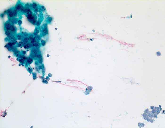Links im Bild ein Verband respiratorischer Epithelien mit vergrösserten atypischen Kernen. Rechts unten im Bild ein schlecht erhaltener Verband kleiner nacktkerniger Zellen, deren Kerne sich gegenseitig eindellen ( Kleinzelliges Karzinom).