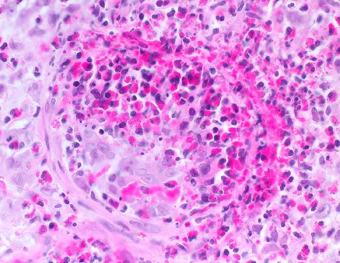 Ausgeprägte von eosinophilen dominierte destruktive Gefässwandentzündung.