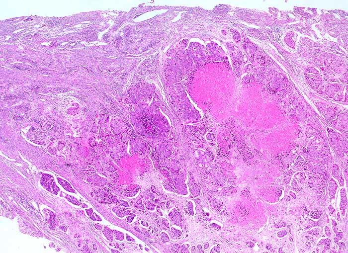 Infiltrate eines soliden Adenokarzinoms mit ausgedehnten komedoartigen Nekrosen gut passend zu Metastasen eines Kolonkarzinoms. Gefässeinbrüche.