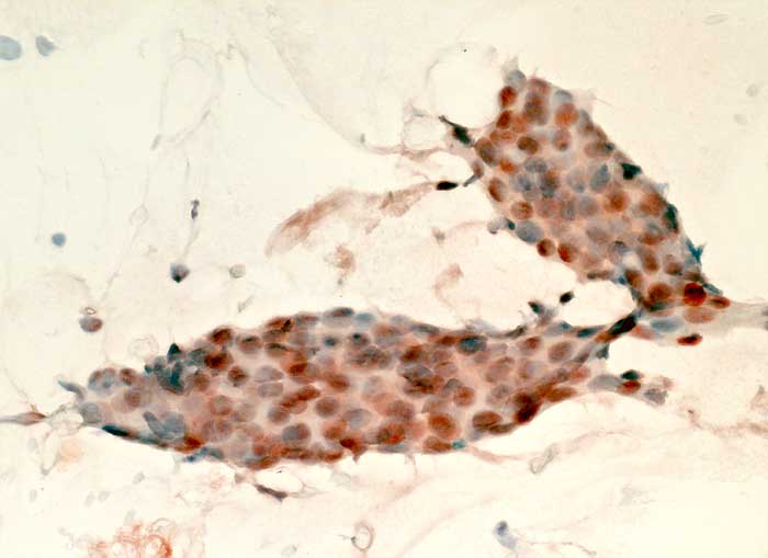 Praktisch alle Tumorzellkerne zeigen eine starke Positivität für den Östrogenrezeptor.