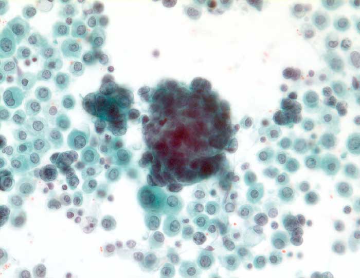 atypischer Zellen mit polymorphen hyperchromatischen Kernen, die sich gegenseitig eindellen und einem sehr schmalen Zytoplasma.