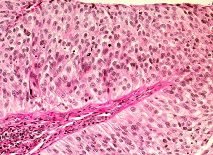 Das bedeckende Urothel des papillären Tumors ist deutlich verdickt. Verglichen mit normalem Urothel sind die Zellen dieses mässig differenzierten Tumors leicht vergrössert, unregelmässig gelagert und hyperchromatisch. Gelegentlich sind Mitosen nachweisbar. Die Epithel-Stroma Grenze ist scharf.